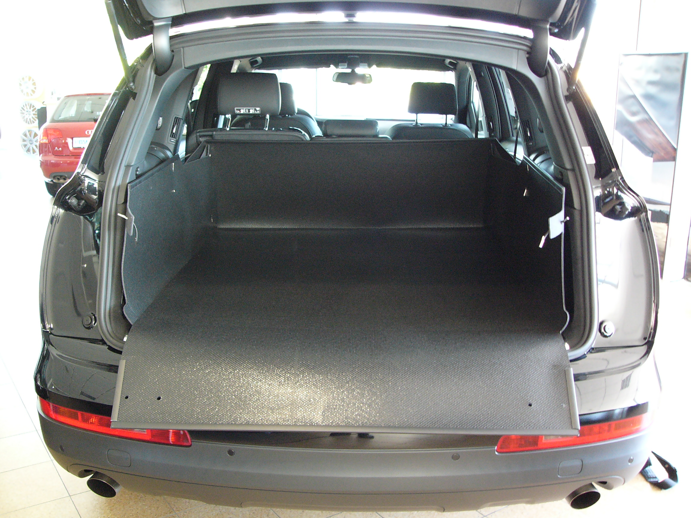 Unsere Kofferraumwanne schützt rundum den Kofferraum Ihres Audi Q7 einschl. der Ladekante und der Stoßstange; M00, d.h. die Rücksitze bleiben immer in ihrer ursprünglichen Position. Sie können bedenkenlos Ihren Hund aber auch schmutzerzeugende, schwere, spitze Gegenstände transportieren. Diese Kofferraumverkleidung ist eine passgenaue, formstabile, selbsttragende und robuste Kofferraumwanne, daher muss sie nicht wie bei formlosen Schutzplanen, Gewebeplanen, Autoschondecken mittels Schnüre oder Klettbänder mit dem Fahrzeug umständlich verbunden werden; sie presst sich gegen die Wände des Kofferraums und gegen die Rückenlehnen und verschwendet somit keinen wertvollen Raum. Der inhaenger ist ein Kofferraumschutz, den Sie als eine ideale Hundebox bzw. Hundetransportbox verwenden können, immer frei von Hundehaaren, Schmutz und Nässe sowie uneingeschränkt zum Transport von allem, was im Alltag, Beruf, Sport und im Gelände anfällt.