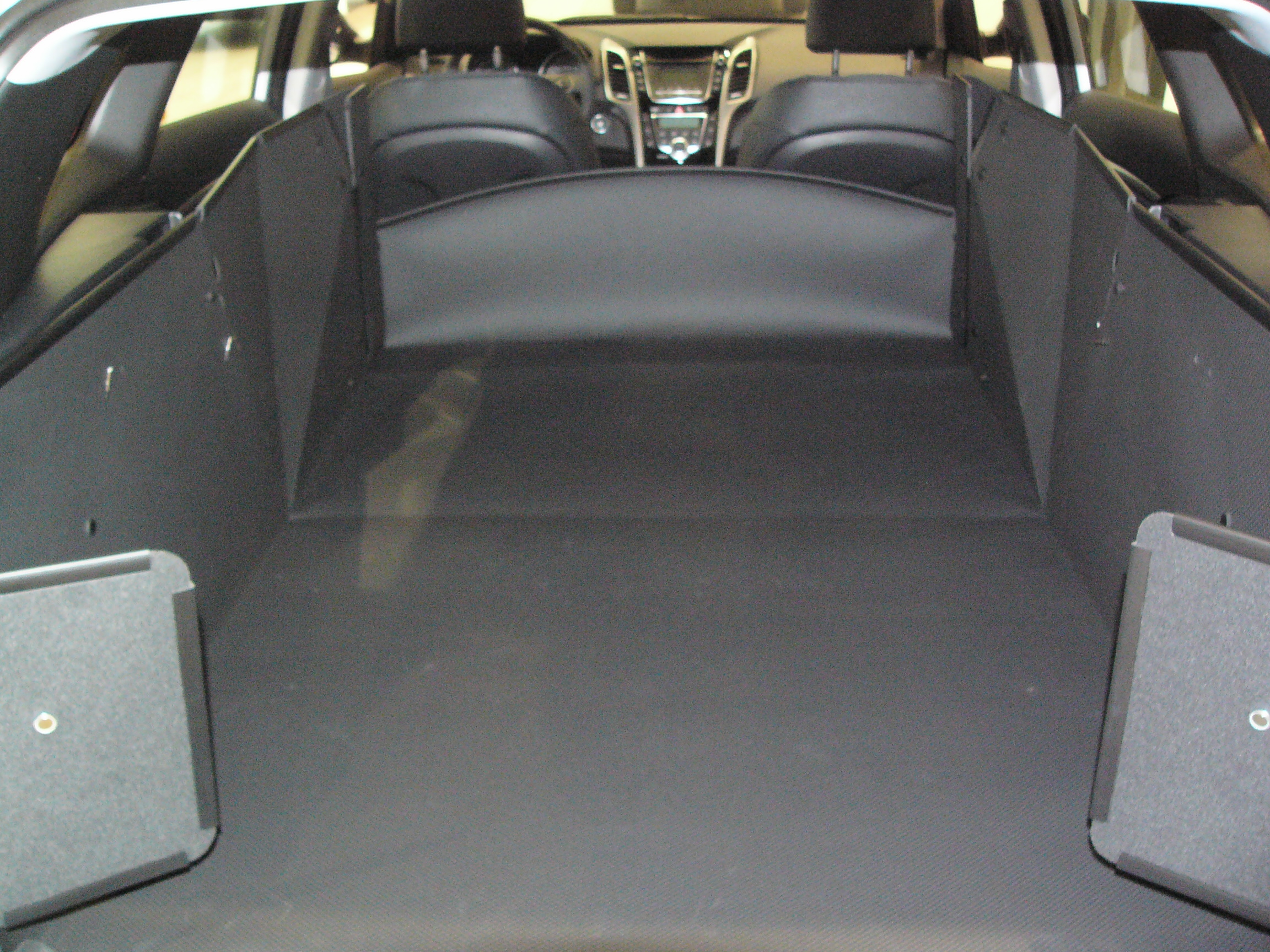 formstabiler Kofferraumschutz muss nicht wie bei formlosen Schutzplanen, Gewebeplanen, Autoschondecken mittels Schnüren oder Klettbändern mit dem Fahrzeug verbunden werden; sie presst sich gegen die Wände des Kofferraums und gegen die Rückenlehnen und verschwendet somit keinen wertvollen Raum.