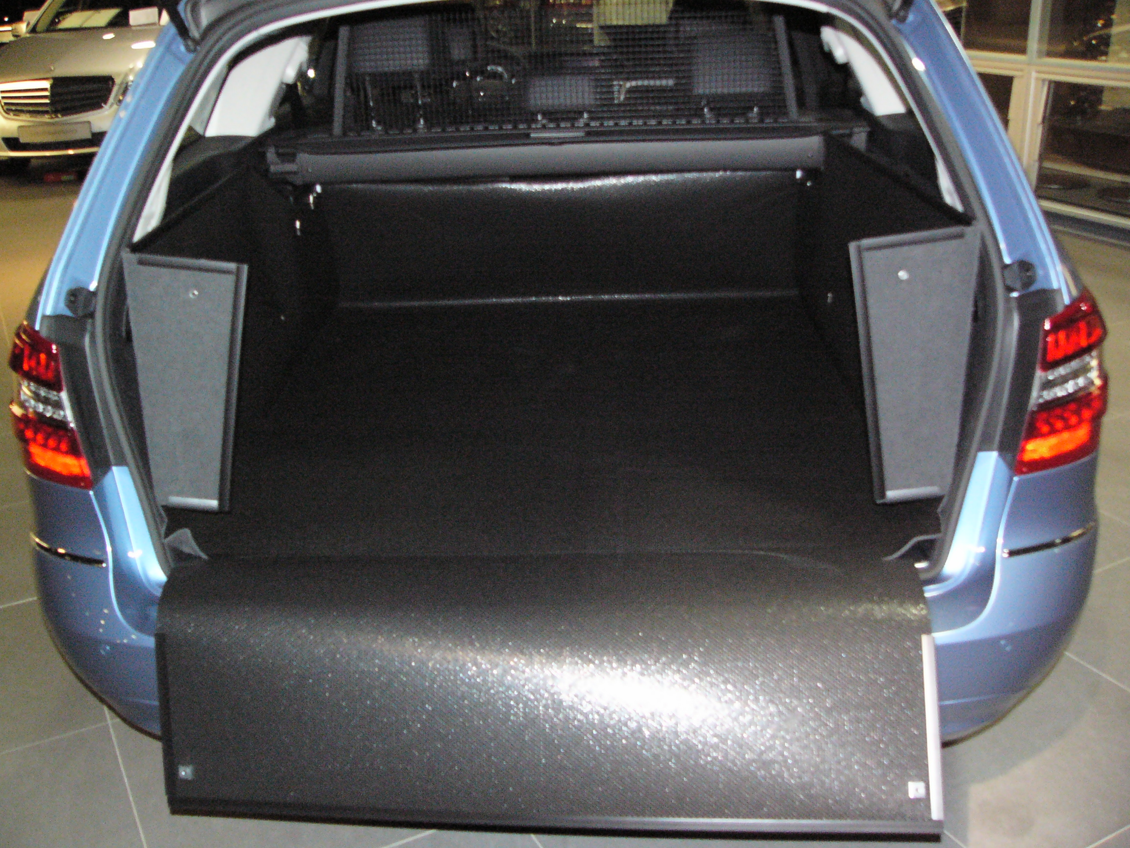 Der Kofferraumschutz, Modell inhaenger L11, schützt den Kofferraum von Mercedes E-Klasse T-Modell rundum und fensterhoch, wenn die Rücksitze in aufgestellter Position sind oder den gesamten verfügbaren Laderaum, wenn die Rücksitze heruntergeklappt sind. Der Schutz der Ladekante und der Stoßstange ist in die Kofferraumwanne integriert. Das Modell L11 können Sie z.B. als Hundebox nutzen und Ihre Fahrgäste mitnehmen oder Sie können die Rücksitze umklappen, den inhaenger blitzschnell ausfalten und z.B. Ihr Fahrrad transportieren oder Gartenabfälle abfahren, ohne dass der Laderaum schmutzig oder Ihr Fahrzeug beschädigt wird. Das Material des inhaengers ist so robust, dass Sie Ihr Fahrzeug professionell zum Transport von schweren, schmutzigen und sperrigen Gegenständen nutzen können. Unser passgenauer, formstabiler Kofferraumschutz muss nicht wie bei formlosen Schutzplanen, Gewebeplanen, Autoschondecken mittels Schnüren oder Klettbändern mit dem Fahrzeug verbunden werden; sie presst sich gegen die Wände des Kofferraums und gegen die Rückenlehnen und verschwendet somit keinen wertvollen Raum.