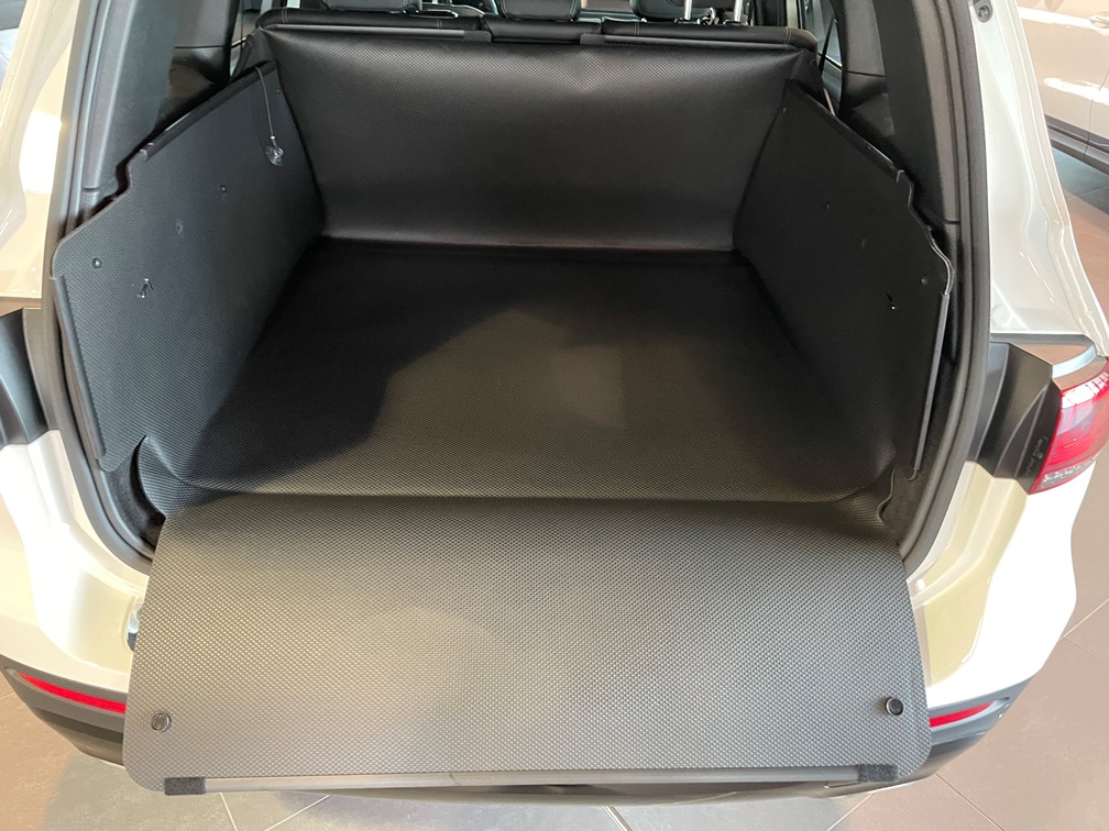 Dieser Kofferraumwanne verkleidet den Kofferraum Ihres Mercedes EQB bei aufrechten oder den gesamten verfügbaren Laderaum bei umgeklappten Rücksitzen. In der ersten Gebrauchsstellung können Sie z.B. Ihren Hund sicher transportieren und im Fond Fahrgäste mitnehmen. In der zweiten Gebrauchsstellung (wenn die Rücksitze heruntergeklappt sind) können Sie Ihr Fahrrad zur Inspektion bringen. Die Ladekante, Stoßstange und die Heckklappe werden in beiden Gebrauchstellungen zuverlässig geschützt.