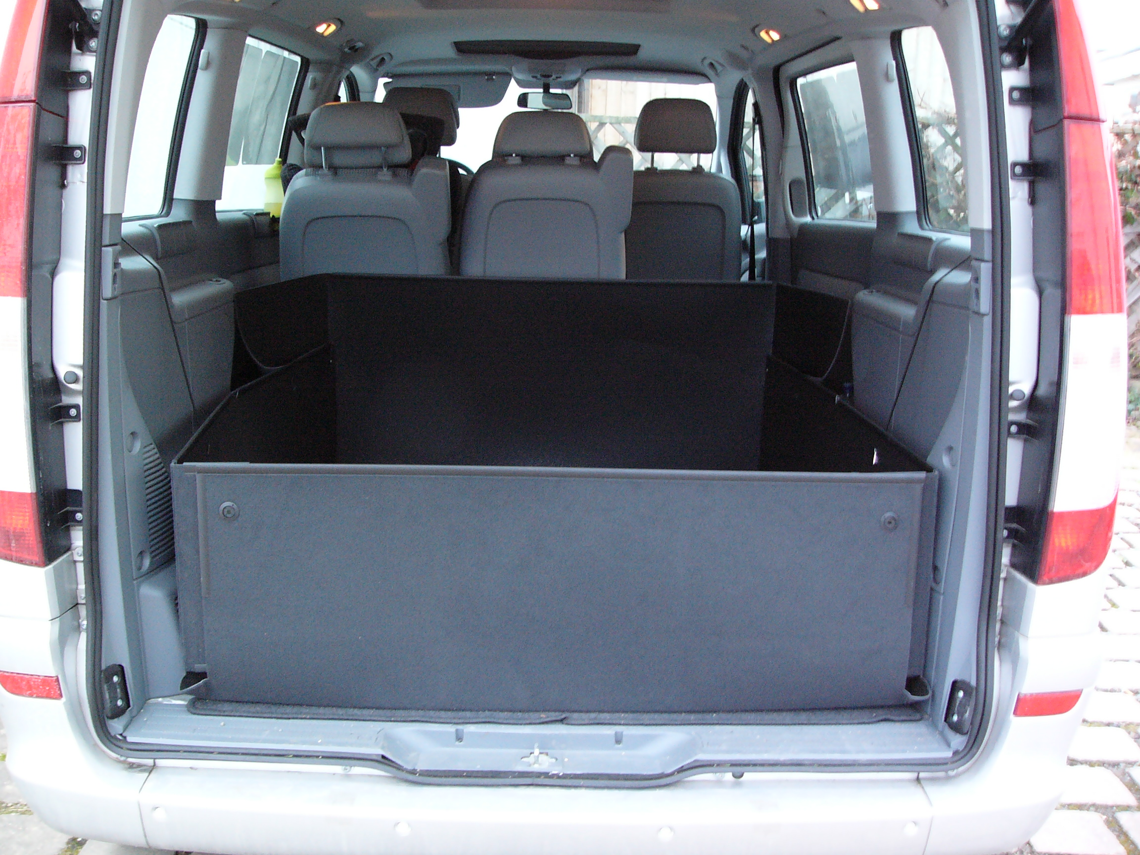 Laderaumschutz verkleidet den Laderaum Ihrer Mercedes V-Klasse 60 cm hoch, die Rückwand mit 90 cm bis auf die Oberkante der Rückenlehnen. Sie können mit diesem soliden und dauerhaft zuverlässigen Schutz Werkzeuge und schwere, kantige und spitze Werkstücke, die Sie alltäglich professionell transportieren müssen, bedenkenlos auf die Ladefläche schieben. Unsere Kofferraumverkleidung ist eine passgenaue, formstabile, selbsttragende und unverwüstliche Kofferraumeinlage, die Sie immer und überall ohne Bedenken einsetzen können. Die Robustheit und Zuverlässigkeit dieses Laderaumschutzes werden Sie im Alltag überzeugen. Genauso wie Sie ihn für beliebigen Transport nutzen können, können Sie ihn auch als eine ideale Hundebox bzw. Hundetransportbox verwenden. Sollten Sie den Laderaumschutz nicht benötigen und einen aufgeräumten Laderaum haben wollen, können Sie ihn sekundenschnell zu einer Bodenmatte zusammenklappen und als Matte im Fahrzeug belassen und saubere Gegenstände darauf legen.
