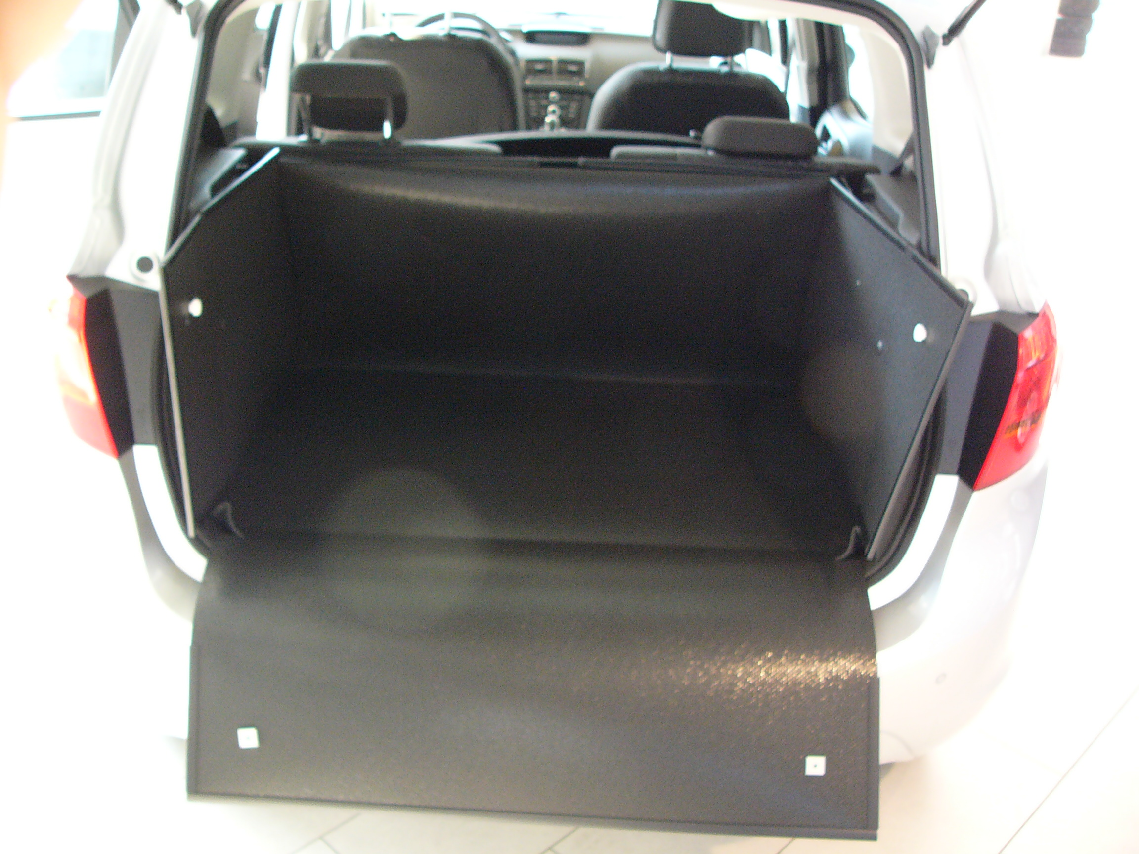 Dieser Kofferraumschutz verkleidet den Kofferraum Ihres Opel Meriva rundum und komplett, die Rücksitze sind um 10 cm vorgeschoben. Sie können bedenkenlos Ihren Hund, der nass und schmutzig sein und triefen darf, transportieren aber auch schmutzerzeugende, spitze Gegenstände. Unsere Kofferraumverkleidung ist eine passgenaue, formstabile, selbsttragende und unverwüstliche Kofferraumeinlage, die mit dem Fahrzeug nicht verbunden werden muss mittels Schnüren oder Klettbändern, wie bei formlosen Schutzplanen, Gewebeplanen, Autoschondecken. Im Gegenteil, der inhaenger ist ein Kofferraumschutz, der ohne äußere Unterstützung, selbstständig aufrecht steht und Ihren Kofferraum optimal nutzt, ohne vom wertvollen Raum etwas zu verlieren. Sie können ihn allgemein für den Transport und speziell als eine ideale Hundebox bzw. Hundetransportbox verwenden.