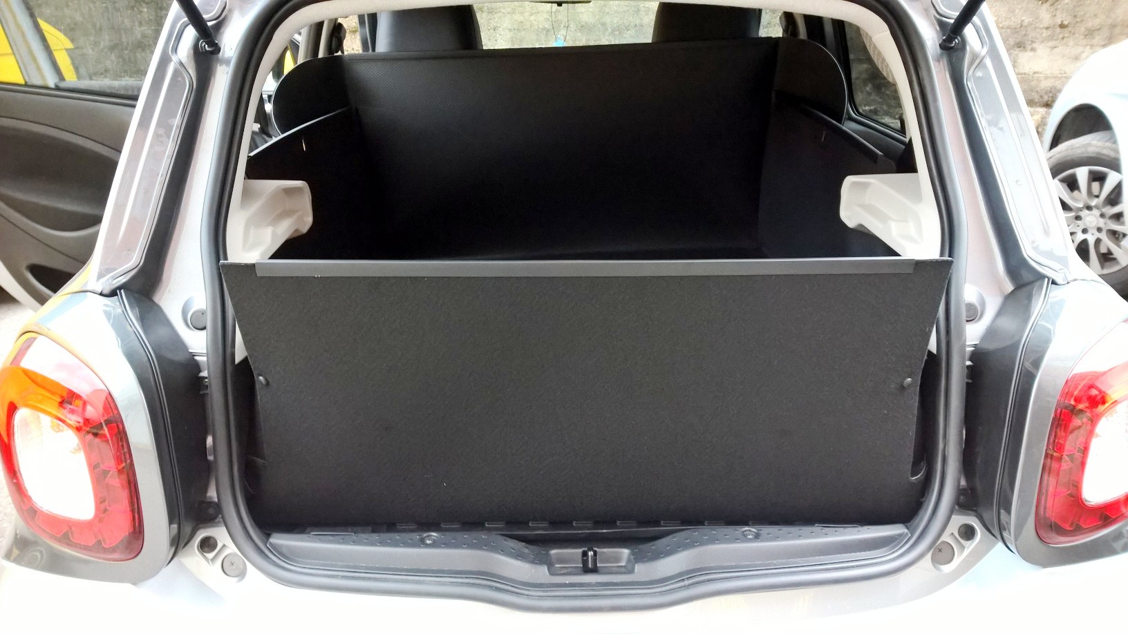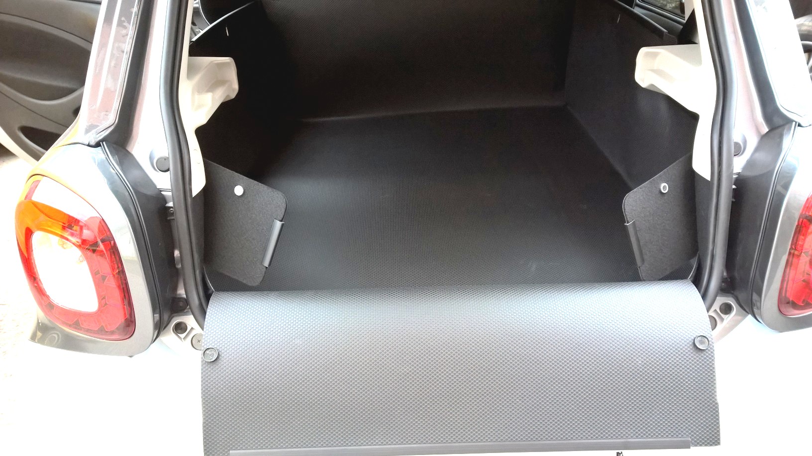 Unsere Kofferraumwanne schützt den gesamten Kofferraum Ihres smart for 4 komplett von der Ladeklappe bis zum Fahrersitz bei permanent umgeklappten Rücksitzen. Sie können bedenkenlos Ihren Hund aber auch schmutzerzeugende, schwere, spitze Gegenstände transportieren. Diese Kofferraumverkleidung ist eine passgenaue, formstabile, selbsttragende und unverwüstliche Kofferraumeinlage, daher muss sie nicht wie bei dünnen und formlosen Schutzplanen, Gewebeplanen, Autoschondecken mittels Schnüren oder Klettbändern mit dem Fahrzeug verbunden werden; sie liegt mit ihrer Wandstärke von 5mm wie eine zweite Haut an den Wänden des Kofferraums und verschwendet daher keinen wertvollen Raum. Der inhaenger ist ein Kofferraumschutz, den Sie als eine ideale Hundebox bzw. Hundetransportbox verwenden können, immer frei von Hundehaaren, Schmutz und Nässe.