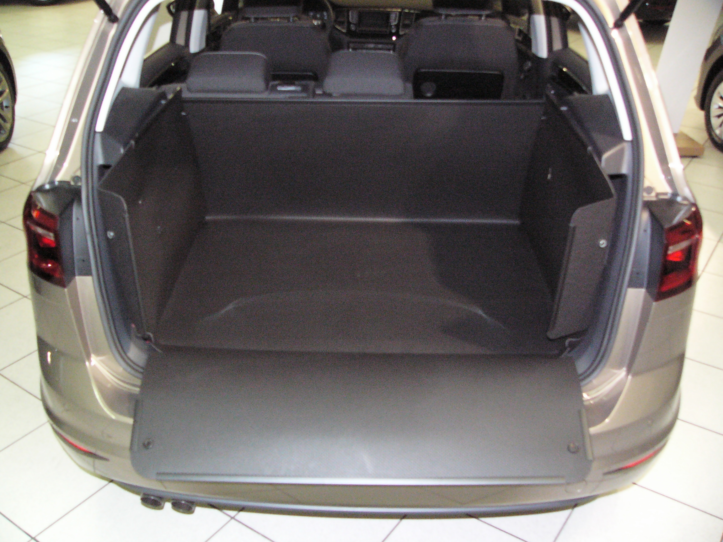 Dieser Kofferraumschutz verkleidet den Kofferraum Ihres VW Golf Sportsvan rundum und komplett. Sie können bedenkenlos Ihren Hund, der nass und schmutzig sein und triefen darf, transportieren aber auch schmutzerzeugende Gegenstände. Unsere Kofferraumverkleidung ist eine passgenaue, formstabile, selbsttragende und unverwüstliche Kofferraumeinlage, die mit dem Fahrzeug nicht verbunden werden muss mittels Schnüren oder Klettbändern, wie bei dünnen und formlosen Schutzplanen, Gewebeplanen, Autoschondecken. Im Gegenteil, der inhaenger ist ein Kofferraumschutz, der ohne äußere Unterstützung, selbstständig aufrecht steht und Ihren Kofferraum optimal nutzt, ohne vom wertvollen Raum etwas zu verlieren. Sie können ihn allgemein für den Transport und speziell als eine ideale Hundebox bzw. Hundetransportbox verwenden. Sollten Sie den Kofferraumschutz nicht brauchen, klappen Sie ihn sekundenschnell zu einer strapazierfähigen Bodenmatte zusammen und Sie haben einen aufgeräumten Kofferraum.
