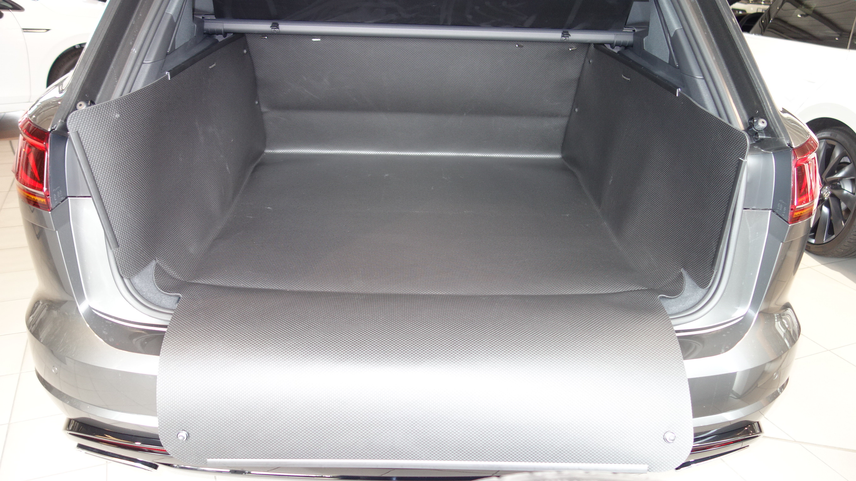 Dieser Kofferraumschutz verkleidet den Kofferraum Ihres VW Touareg rundum und komplett, wenn die Rücksitze in der hinteren und bequemen Position sind. Wenn Sie sie vorschieben um ca. 18 cm, können Sie sekundenschnell Ihren Kofferraumschutz um diese 18 cm verlrößern. Sie können bedenkenlos Ihren Hund, der nass und schmutzig sein darf, transportieren aber auch schmutzerzeugende Gegenstände. Unsere Kofferraumveauskleidung ist eine passgenaue, selbsttragende und unverwüstliche Kofferraumwanne, die mit dem Fahrzeug nicht verbunden werden muss mittels Schnüren oder Klettbändern, wie bei dünnen und formlosen Schutzfolien, Gewebeplanen, Autoschondecken. Im Gegenteil, der inhaenger ist ein Kofferraumschutz, der ohne äußere Unterstützung, selbstständig aufrecht steht und Ihren Kofferraum optimal nutzt, ohne vom wertvollen Raum etwas zu verlieren. Sie können ihn allgemein für den Transport und speziell als eine ideale Hundebox bzw. Hundetransportbox verwenden. Sollten Sie den Kofferraumschutz nicht brauchen, klappen Sie ihn blitzschnell zu einer strapazierfähigen Bodenmatte zusammen und Sie haben einen aufgeräumten Kofferraum.